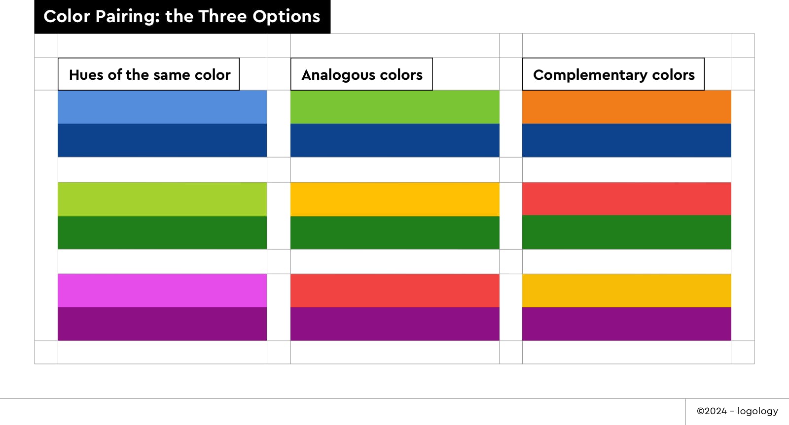 → the 2 colors are hues of the same one (e.g., pastel blue + deep blue). The combination will look naturally harmonious, with a demeanor of simplicity.